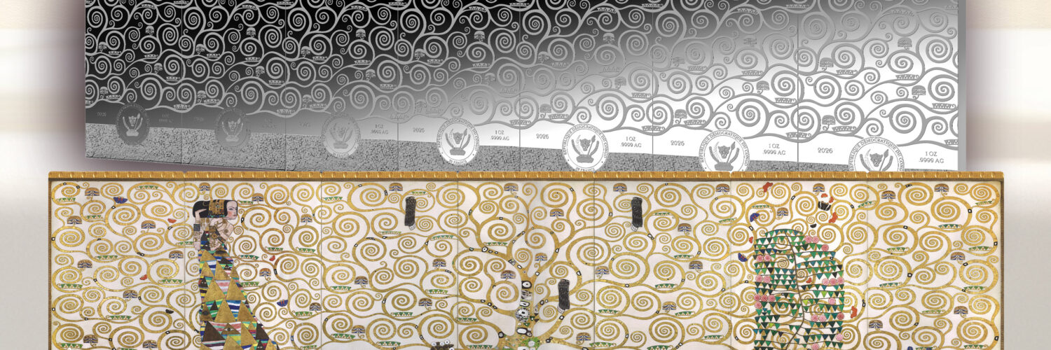 7 x 1 oz of fine 9999 silver! With partial gold plating, gold glitter, color printing, and black platinum! Edgeless minting! The “Edgeless Minting – Stoclet Fries” set pays tribute to Gustav Klimt’s iconic Stoclet Frieze, one of the defining masterpieces of Viennese Art Nouveau. Struck from 7 x 1...
