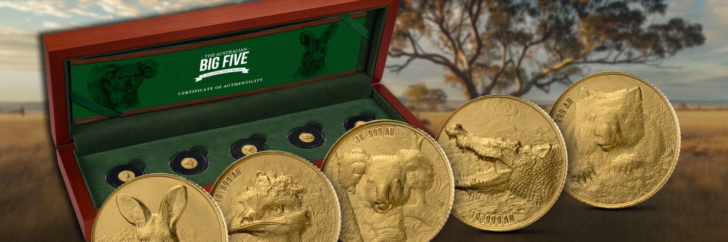 The set includes a total of 5 coins, each made from one gram of fine 999 gold. Their designs feature Australia‘s native animals: the kangaroo, koala, crocodile, wombat, and emu.