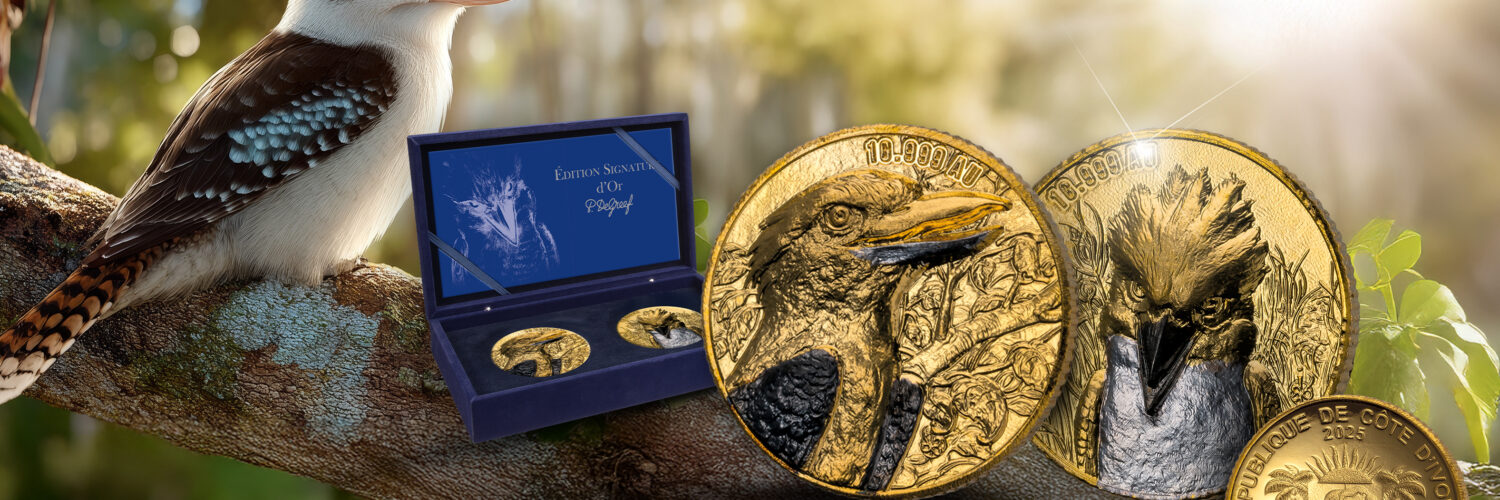 2 × 1 g of fine 999 gold! Refined with black platinum, black rhodium, and white rhodium! Low mintage of only 999 sets! The “Édition Signature – Kookaburra” presents a refined set of two 1 g coins struck from 999 gold and issued by the renowned Brussels mint P. De Greef. Designed by acclaimed artist...