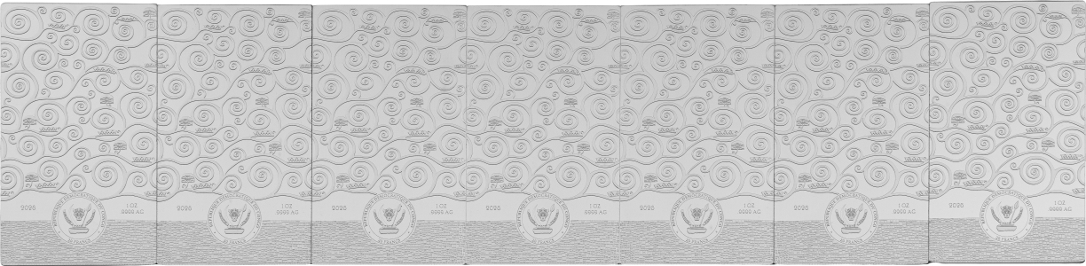 The “Edgeless Minting – Stoclet Fries” set pays tribute to Gustav Klimt’s iconic Stoclet Frieze, one of the defining masterpieces of Viennese Art Nouveau. Struck from 7 x 1 oz of fine 9999 silver, the seven bars form a seamless, continuous motif thanks to innovative edgeless minting with exceptional precision. The design is refined with partial gold plating, black platinum accents, color printing, and shimmering gold glitter, creating vivid depth and luminous highlights.