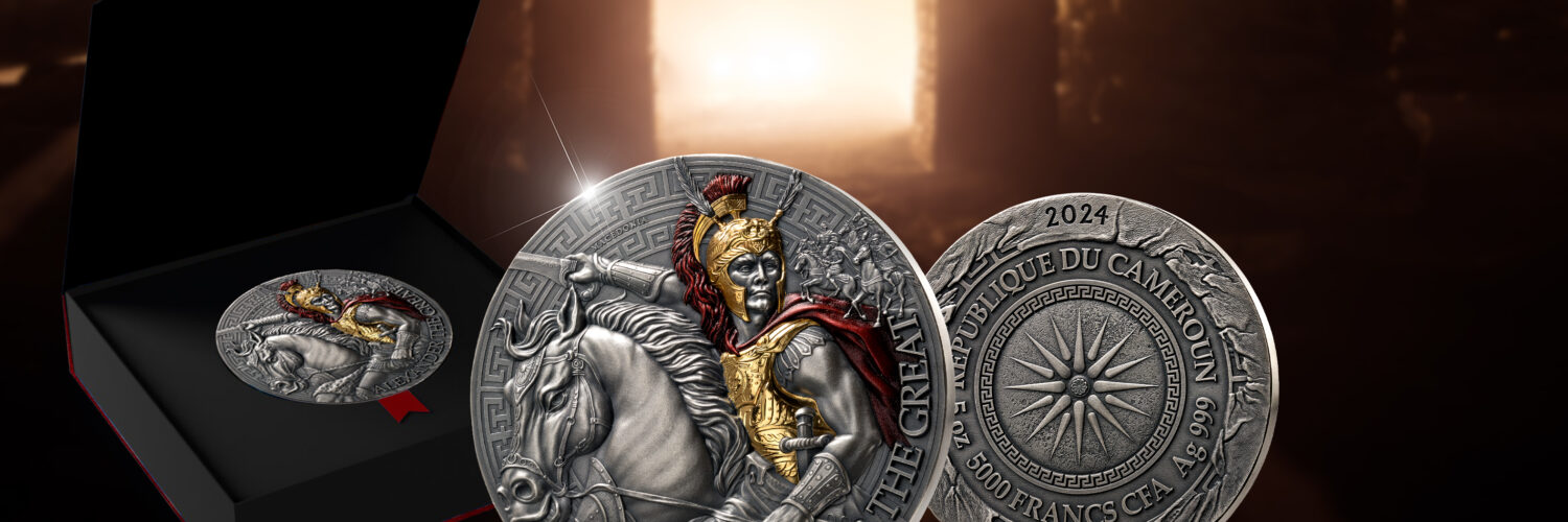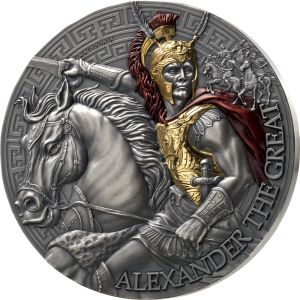The second issue in the Great Commanders series is dedicated to Alexander the Great. This impressive 5 oz silver coin with antique finish is made of 999 silver and impresses with gold and coloured applications that depict Alexander in all his glory. The detailed helmet with feathers, inspired by theoriginal film, lends the coin an extraordinary authenticity. Particularly noteworthy is Alexander‘s lively look from horse back, which conveys an astonishing realism. This coin is a true masterpiece that captures the greatness and glory of one of