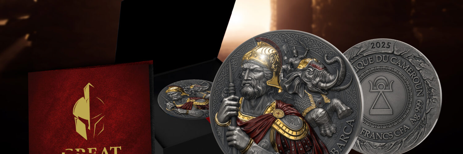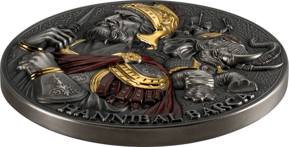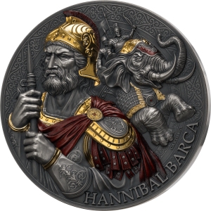 The “Great Commanders” series is a worldwide success. Its latest design is dedicated to the legendary Hannibal. The coin, made of 5 ounces of fine silver, impresses with its unique plasticity, further enhanced by the noble antique finish. Fine gold and delicate color application add spectacular highlights and perfectly showcase all the details of the expressive design featuring Hannibal and his elephant.