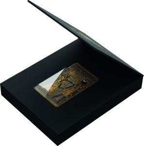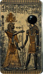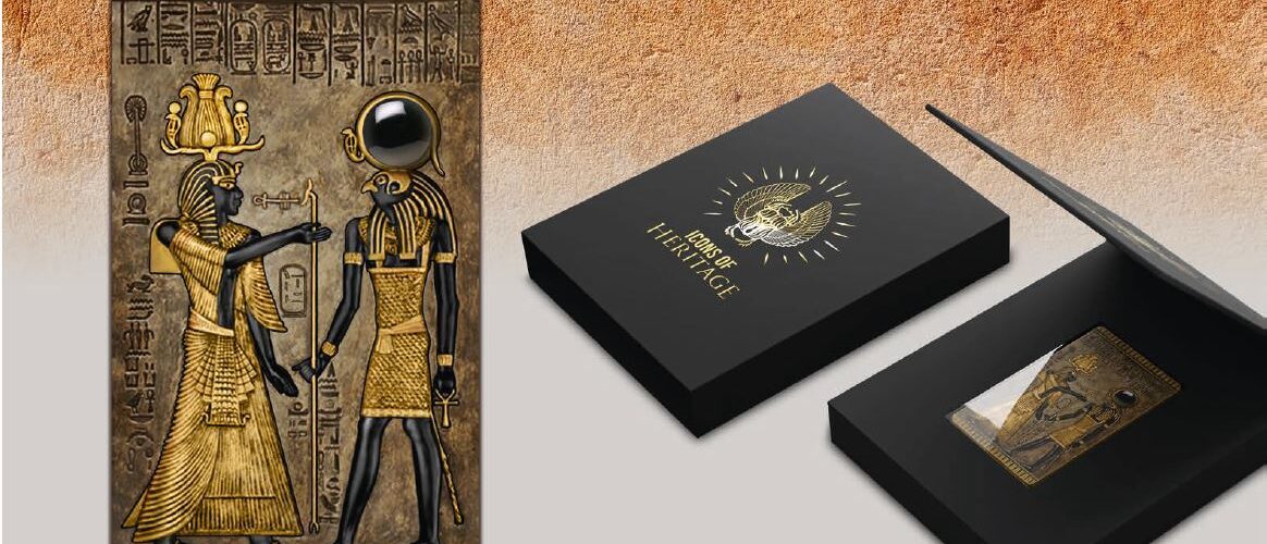 The rich heritage of ancient Egypt has survived the centuries in form of precious artefacts. This heritage is now savoured with a spectacular coin issue: “Icons of Heritage – Egypt”. This 2 oz. 999 pure silver coin shows a pharaoh standing opposite the god Re-Harachte underneath some precisely minted hieroglyphics. Re-Harachte is an affiliation of the divinities Re and Horus, this is why he is presented as a man with the head of the horus falcon and a solar disc above. Instead of the solar disc, this coin bears a beautifully shimmering black onyx cabochon. The 24K gold plating emphasises the detailed coin design, whereas the antique finish brings a tree-dimensional depth.