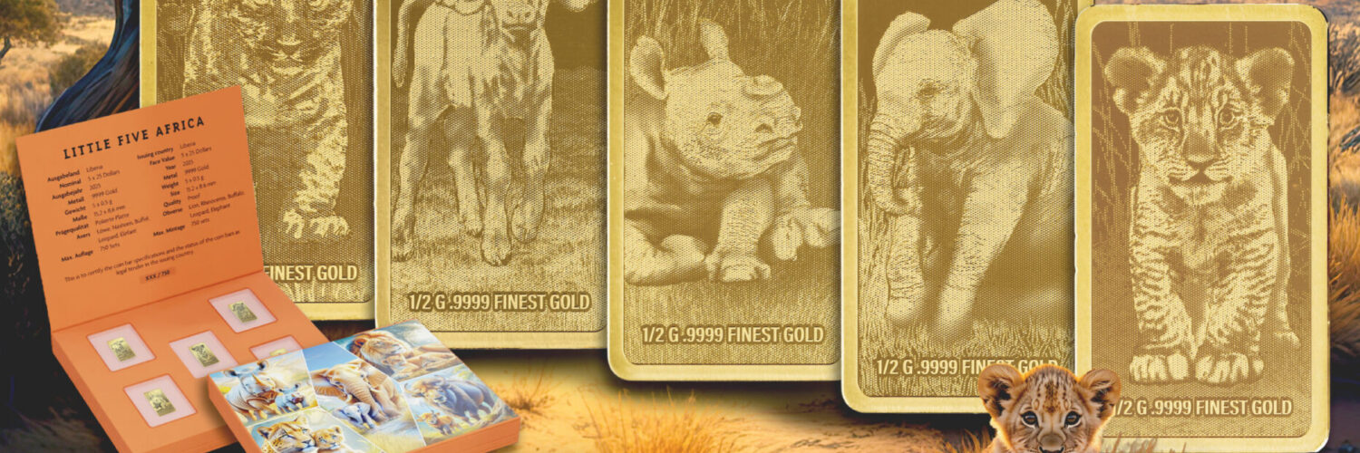 The gold collection “Little Five – Africa” now honors the African Big Five during their early months of life. The five commemorative editions were each minted in finest 9999 gold in the globally successful investment format of 0.5 grams and in the highest minting quality, “Proof”.