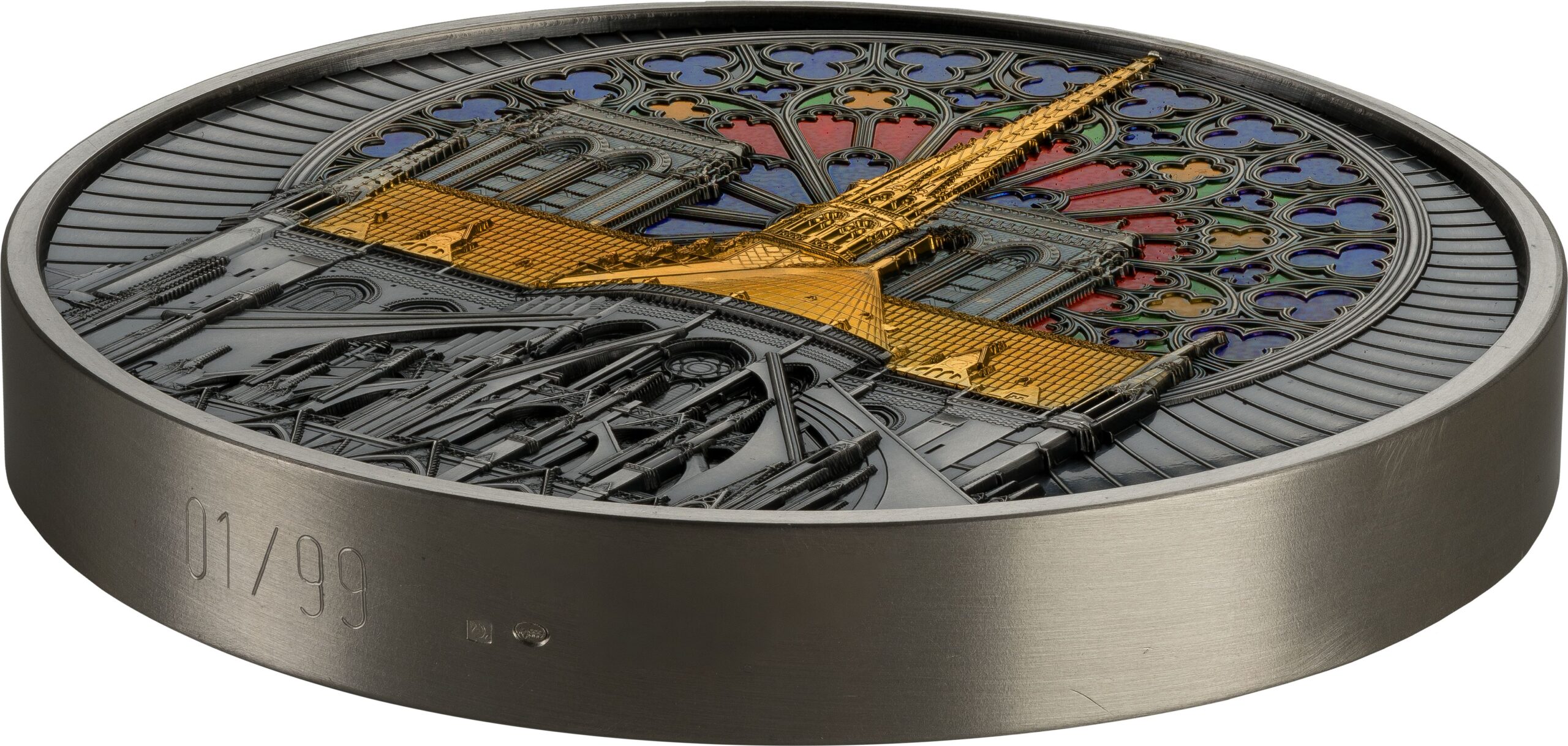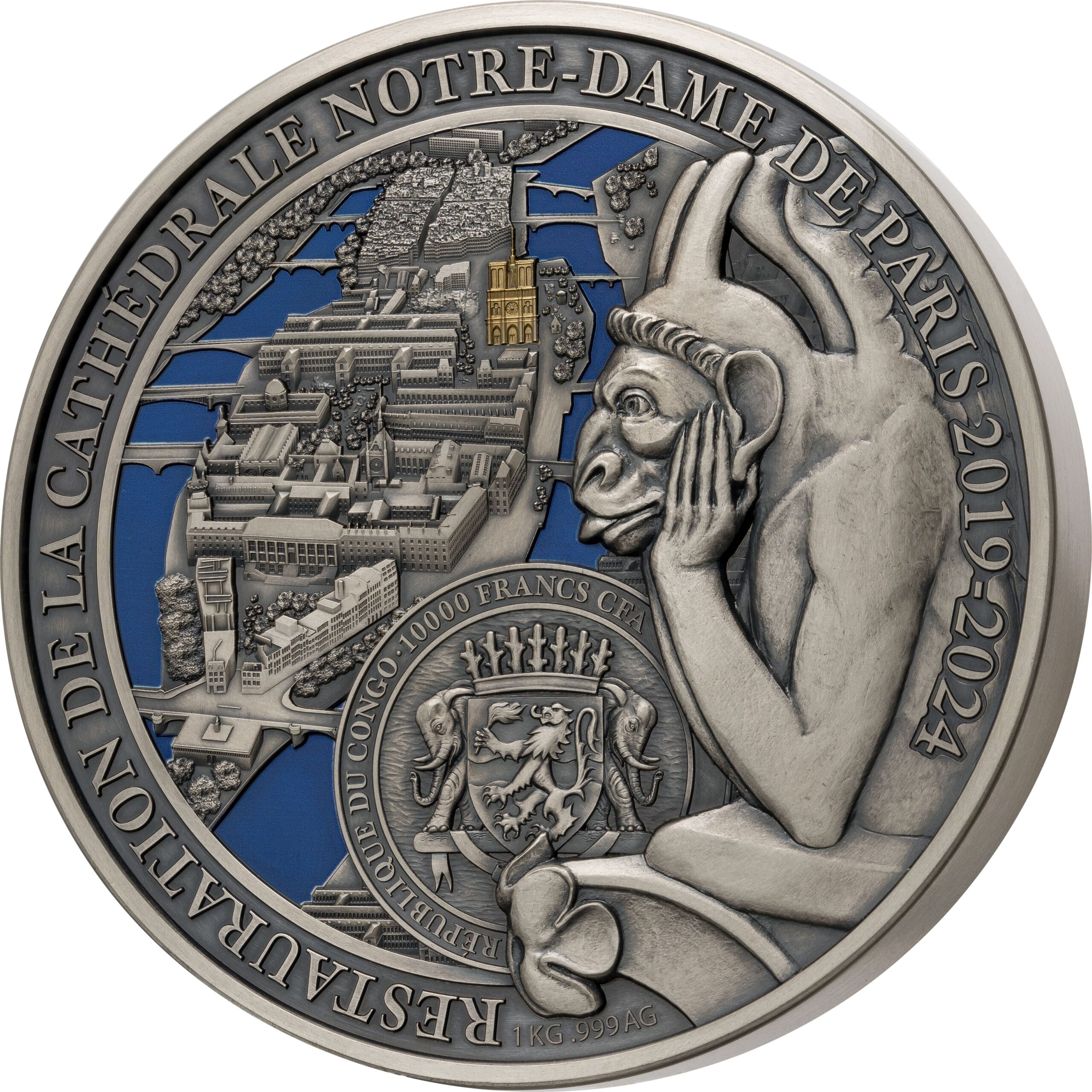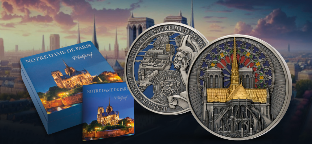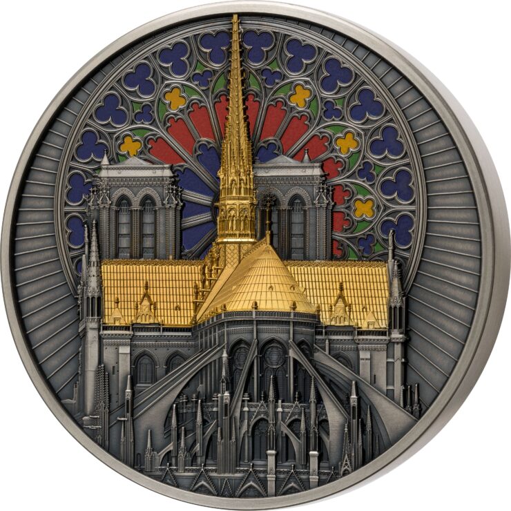 The Notre-Dame de Paris coin is not only an exceptional 1-kilogram silver piece, but also a true artistic delight. Featuring an antique finish and vibrant colour applications,