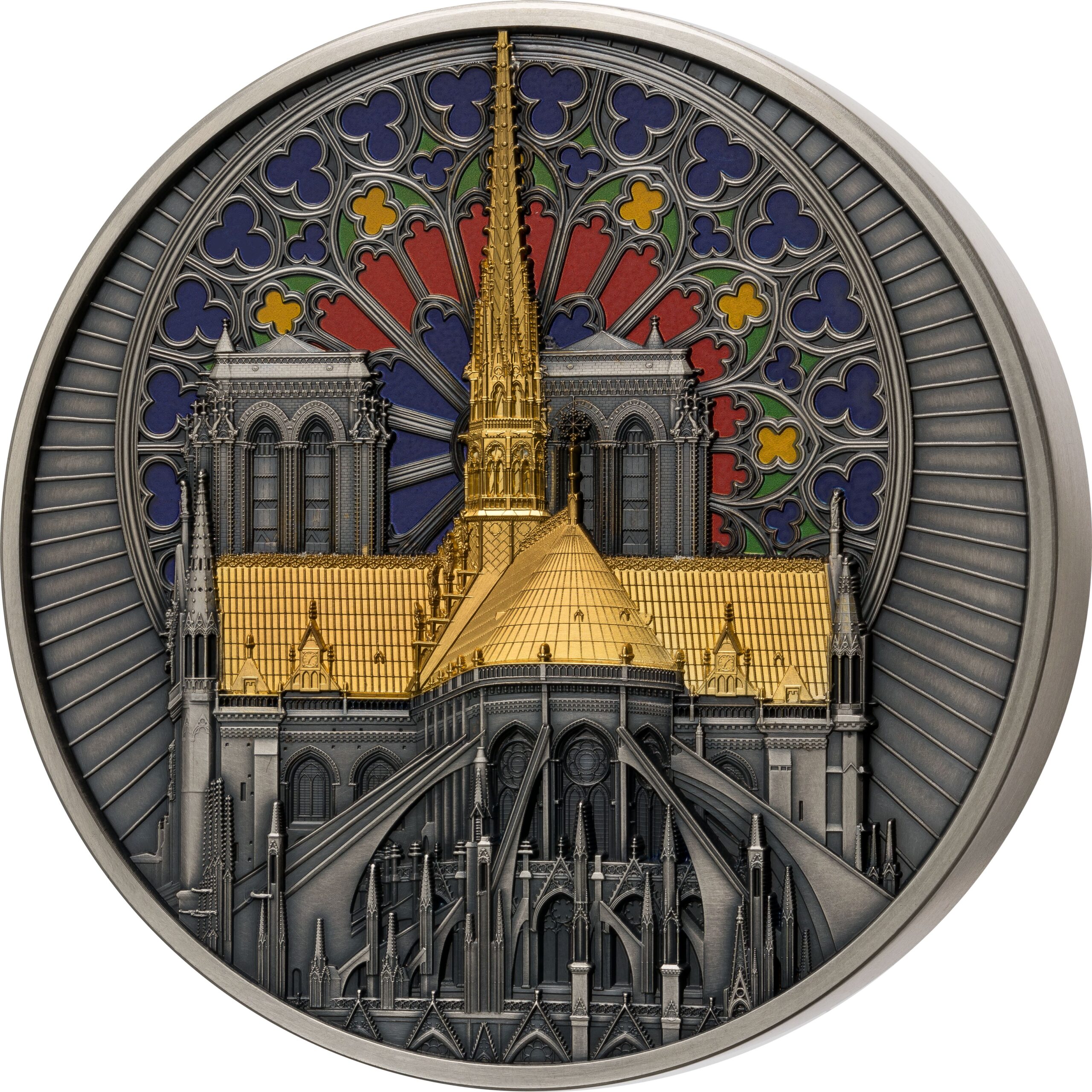 intricately designed and detailed engravings on both sides. The obverse features the stunning rose window of Notre-Dame de Paris in vibrant colours, while the reverse