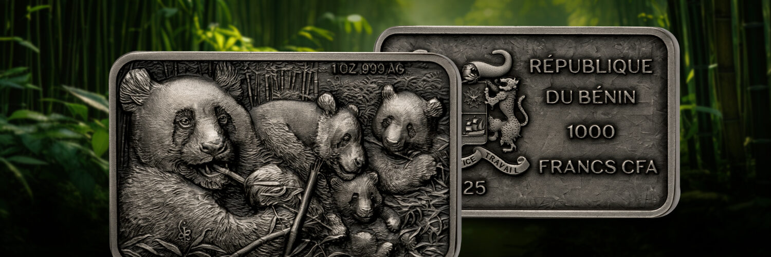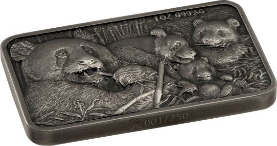 This first edition honors one of the world‘s most fascinating animals: the panda. The artistically designed bar, made of one ounce of fine 999 silver, features a panda family depicted in an intricately detailed high relief. This minting technique gives the collectible a remarkable sense of depth and dimensionality, making the panda family appear almost lifelike.