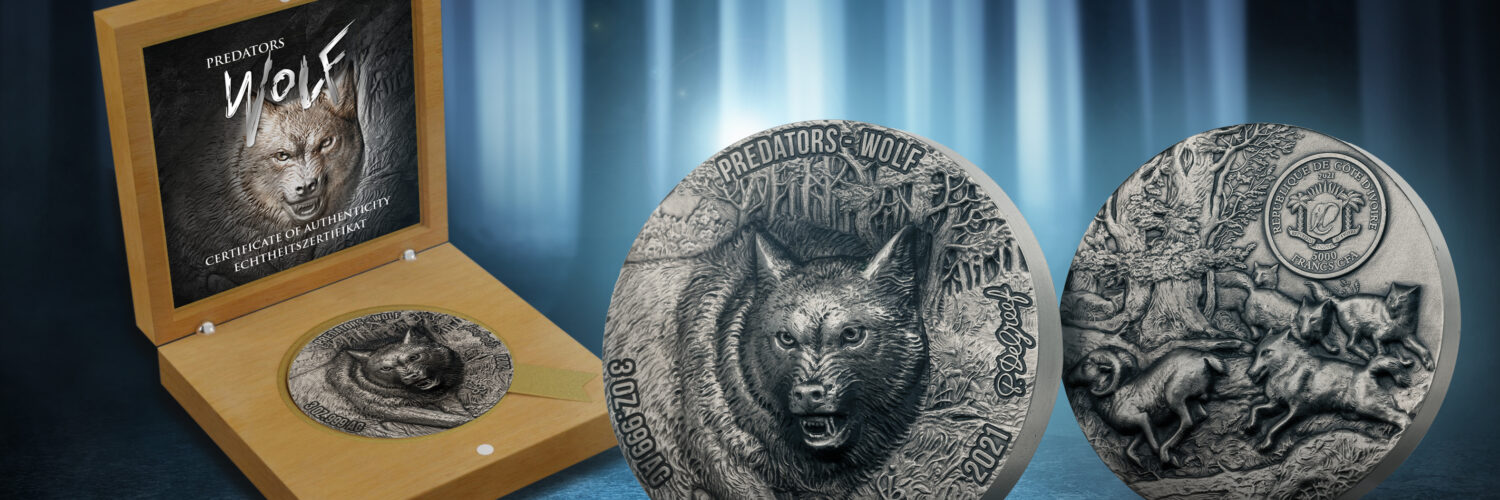 The second release in our burgeoning yet already successful Predator series unveils a formidable scene featuring a snarling wolf on the obverse side. On the reverse side, a dynamic portrayal captures a wolf pack on the hunt for a mouflon. The striking combination of high relief on both sides, coupled with an antique finish, imparts an almost true-to-life impression, elevating the coin’s visual impact and storytelling quality.